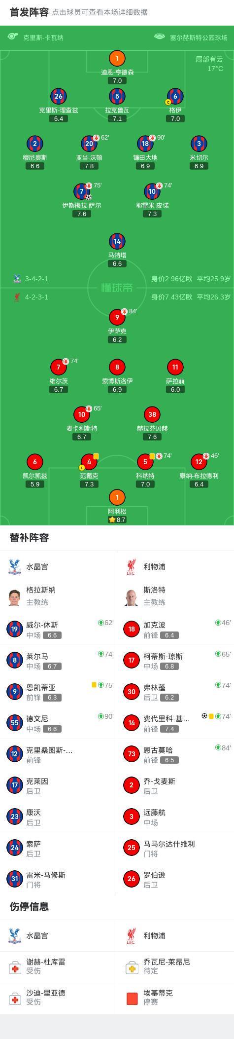 第9分钟,水晶宫角球,萨尔乱战中门前扫射破门,水晶宫1-0利物浦!