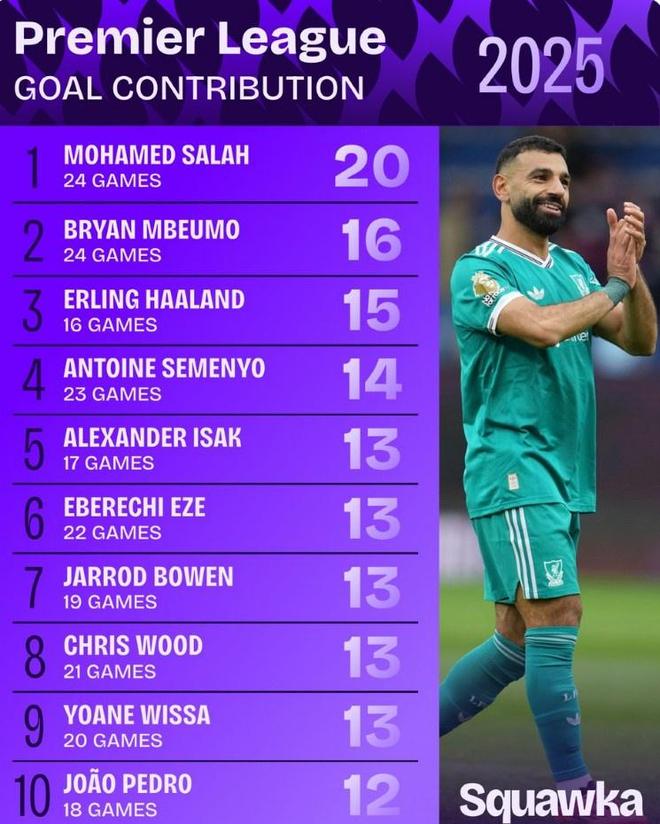 数据网站Squawka盘点了2025年英超参与进球榜(进球+助攻),萨拉赫居首的,具体如下: